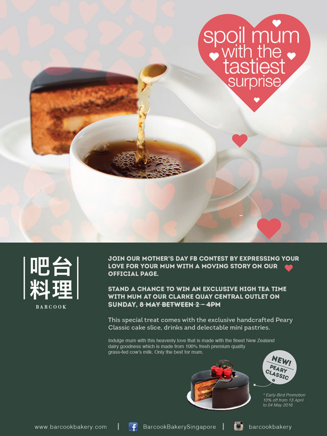 Happy Mother’s Day Posted on April 14, 2016February 14, 2017 by Barcook Bakery Join our Mother’s Day FB Contest by expressing your love for Mum with a moving story on our Facebook post.
